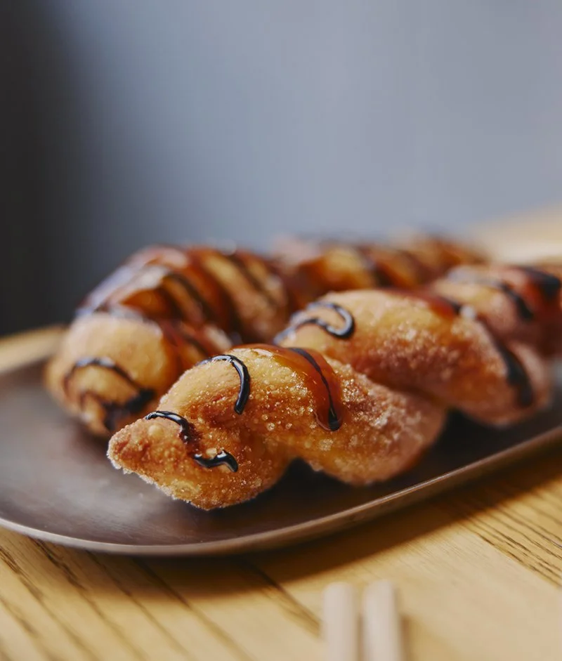 For dessert – our Kkwabaegi (twisted donuts) made fresh to order, dusted in sugar and served with chocolate fudge and miso caramel sauce.