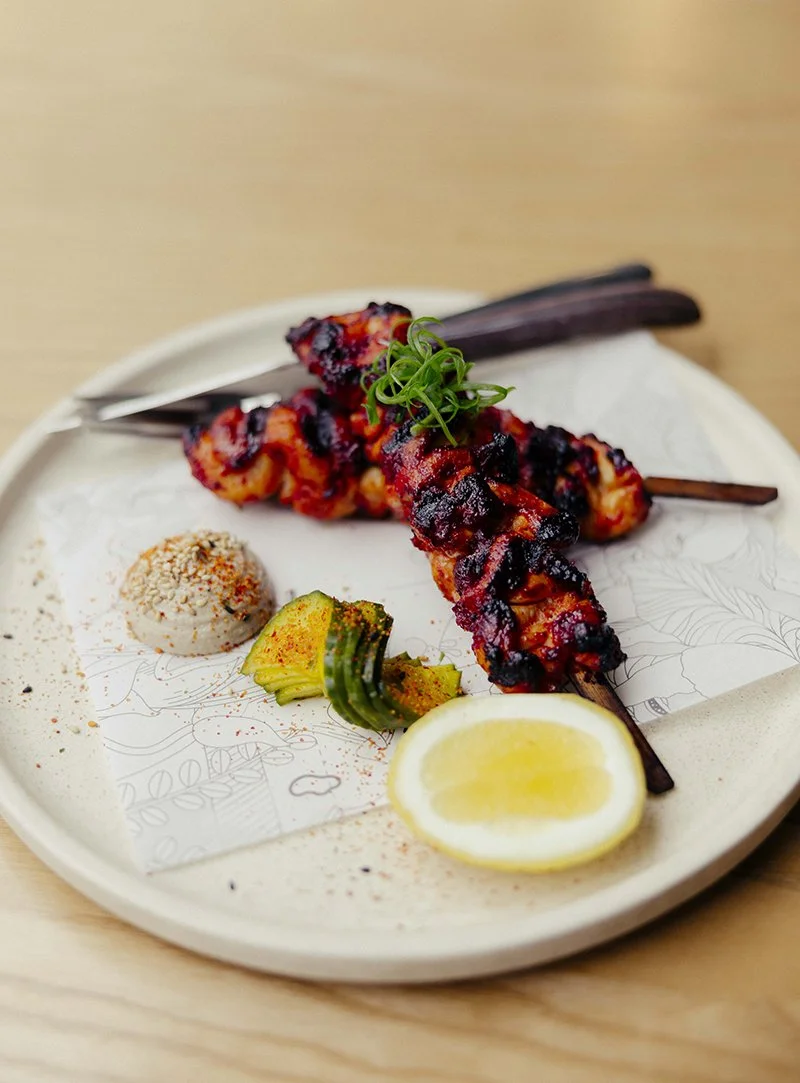 This year we are serving 5 sharing courses starting with a bowl of snacky miso edamame, followed by our spiced tofu savoy cabbage + spinach dumplings with Schezwan tomato + sesame sauce. In all our 7 years, these simple tofu dumplings might be my favourite. Crispy chickpeas, peanuts and fermented chilli crisp give a salty, spicy crunch to them. Yum. Next up is a juicy salt + pepper pork belly gua bao each, served with lightly pickled cucumber, chilli + lime. To finish the savoury dishes – our Korean BBQ chicken skewers, chicken thigh marinated in gochujang, then fired on a high heat on the hibachi, and served with charred broccolini and steamed rice.